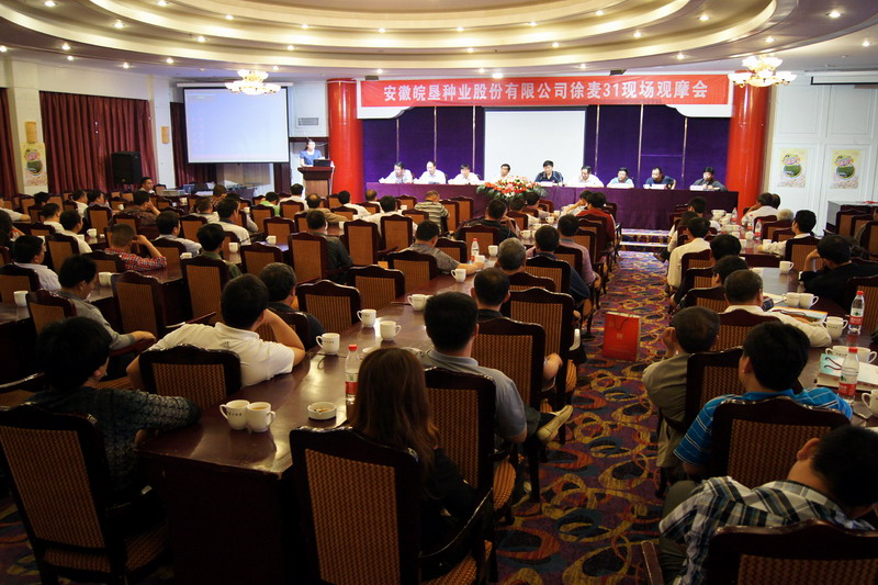 会议背景:徐麦31”系最新国审的优质强筋小麦新品种。2009年通过江苏省审定,品种审定编号为苏审麦2009042011年通过国审,品种审定编号为国审麦2011005,国家植物新品种保护申请号20090488.8,公告号CNA005901E,皖垦种业买断了徐麦31”在安徽、河南的独家永久生产经营权。该品种田间表现优异,主要优点:株型紧凑弹性好,苗势健壮成穗多,抗病抗倒熟像好,穗大无芒品质优。