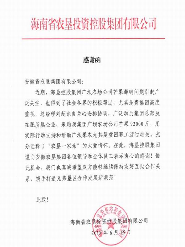 今年海南农垦水果大丰收,但近期销售难、卖价低、果农愁,尤其是广坝农场公司芒果滞销严重。海垦集团发来求助信息,安徽农垦集团高度重视,总经理刘超亲自安排协调,由皖垦农产品超市牵头助销,制定工作方案,广泛动员集团总部及在肥所属企业,联系五星等水果经销商,仅一周时间就销售爱心芒果9.2万斤,倾情支持和帮助广坝果农尤其是贫困职工渡过难关,充分诠释了农垦一家亲的大爱情怀。