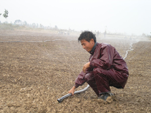 图片说明:连日来,潘村湖农场各职工家庭农场不 等、不靠,全力以赴抗旱秋种。农场技术部门想方 设法为职工抗旱提供支持。10月16日,农场派专车 赴江苏南京采购一批新型微孔喷灌设备,为职工抗 旱作业解了燃眉之急。图为职工正在田间进行节水 高效的微喷作业情景。(杨登宏摄)
